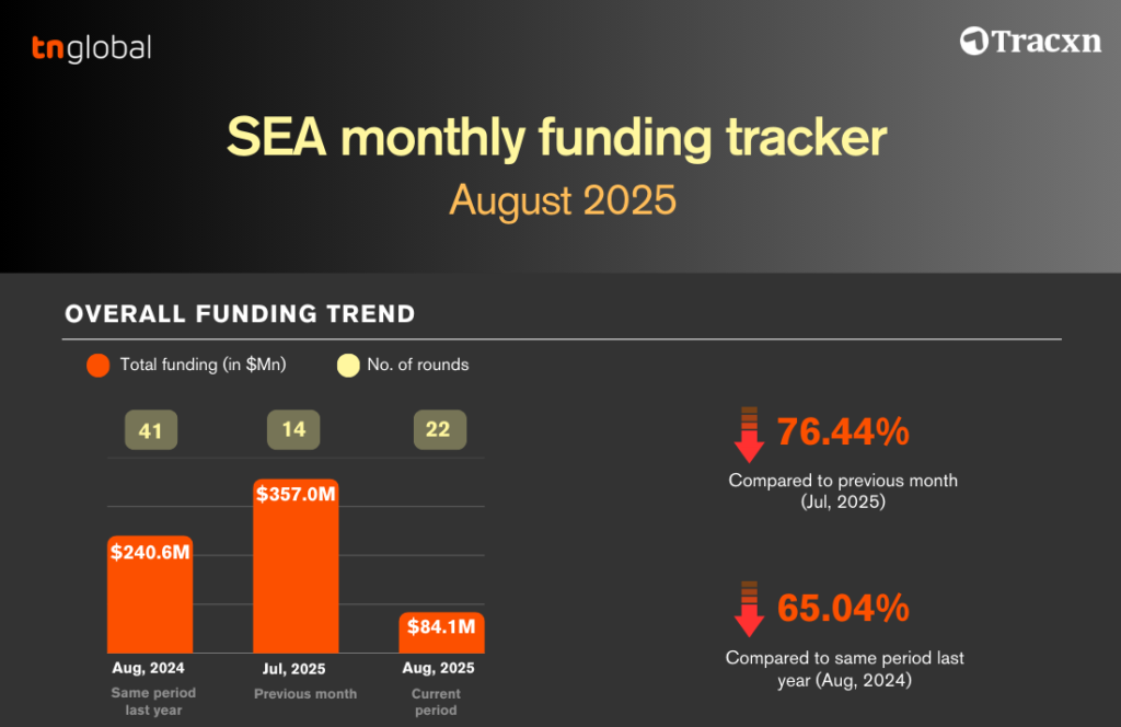 The SEA Monthly Funding Tracker for August 2025 highlighted a steep decline in funding across the region. Total funding in August stood at $84.1 million across 22 rounds, reflecting a 76.44 percent drop from July 2025 ($357 million) and a 65.04 percent fall year-on-year compared to August 2024 ($240.6 million).