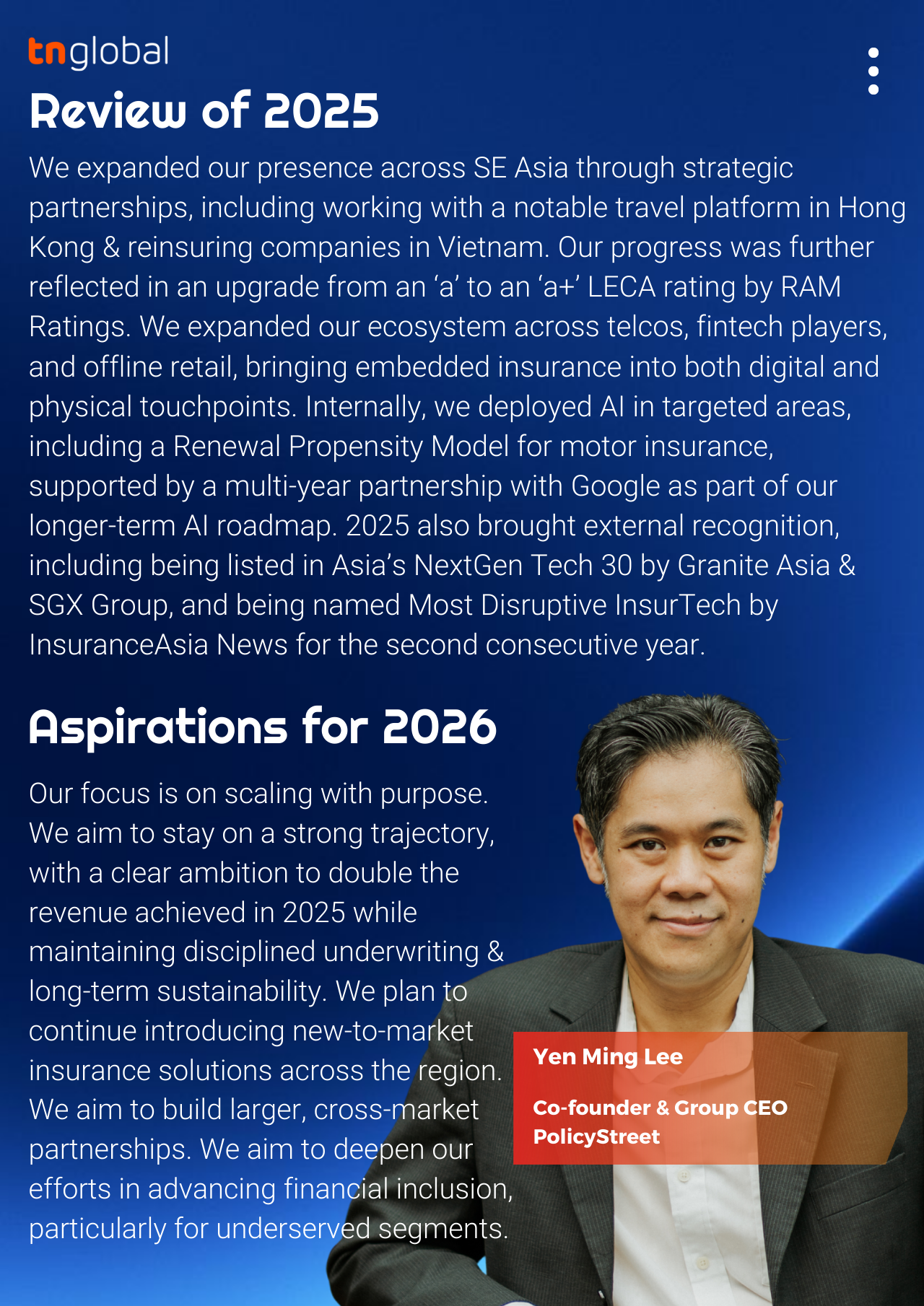We talked to Yen Ming Lee, Co-Founder and Group Chief Executive Officer of PolicyStreet to learn more about the firm’s achievements in 2025 and its plans and aspirations for 2026. He also shared his views on the outlook of tech ecosystem in Southeast Asia in 2026.