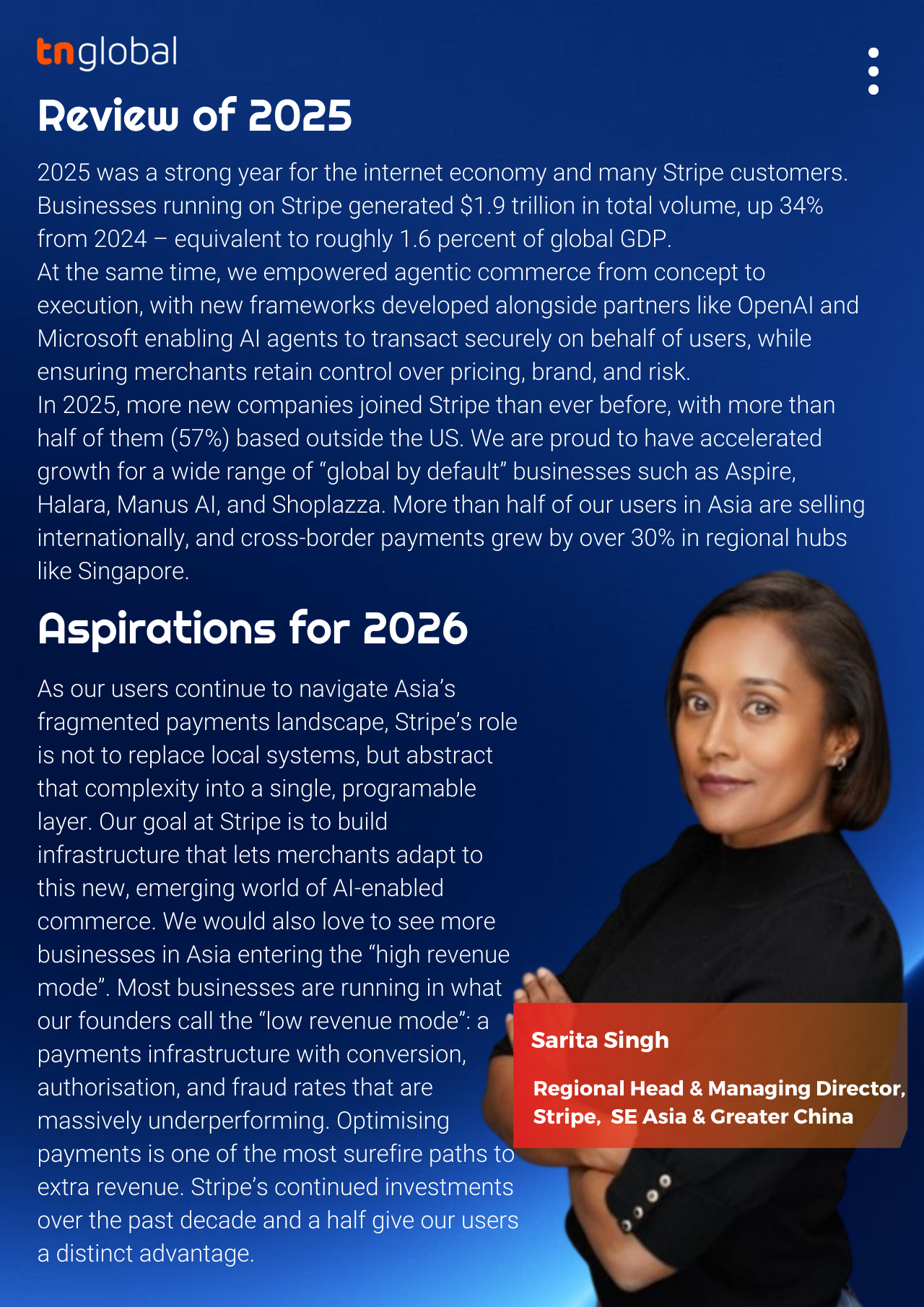 Our priorities for 2026 are grounded in helping businesses adapt to structural shifts in how commerce is built and scaled. Looking ahead, Stripe’s investment will be defined by the twin revolutions in artificial intelligence (AI) and money – two areas where we anticipate a clear, compounding impact for businesses operating globally from Asia.