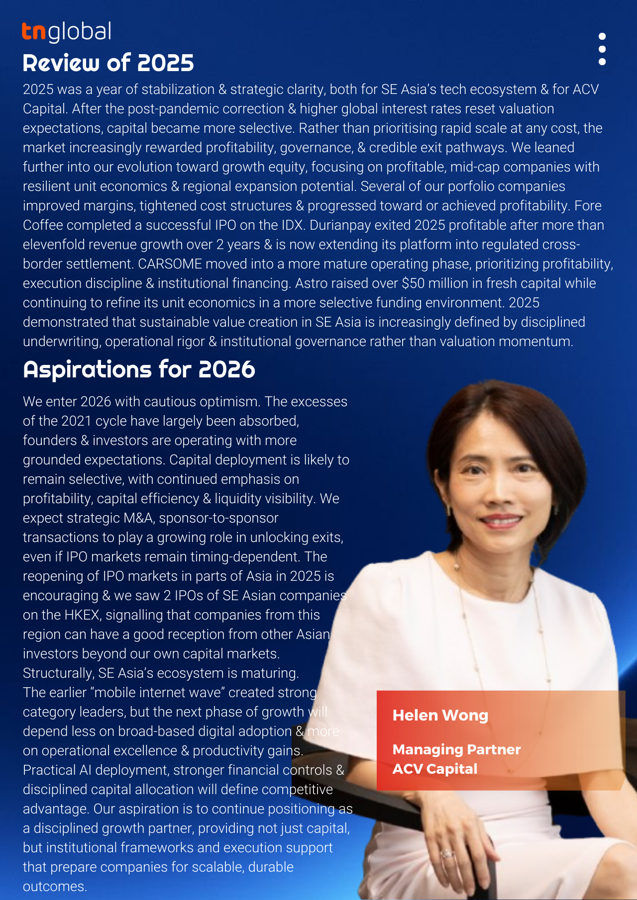 We talked to Helen Wong, Managing Partner at ACV Capital, to learn more about AVC Capital’s achievements in 2025 and its plans and aspirations for 2026. She also shared her views on the outlook of tech ecosystem in Indonesia and Southeast Asia for 2026.