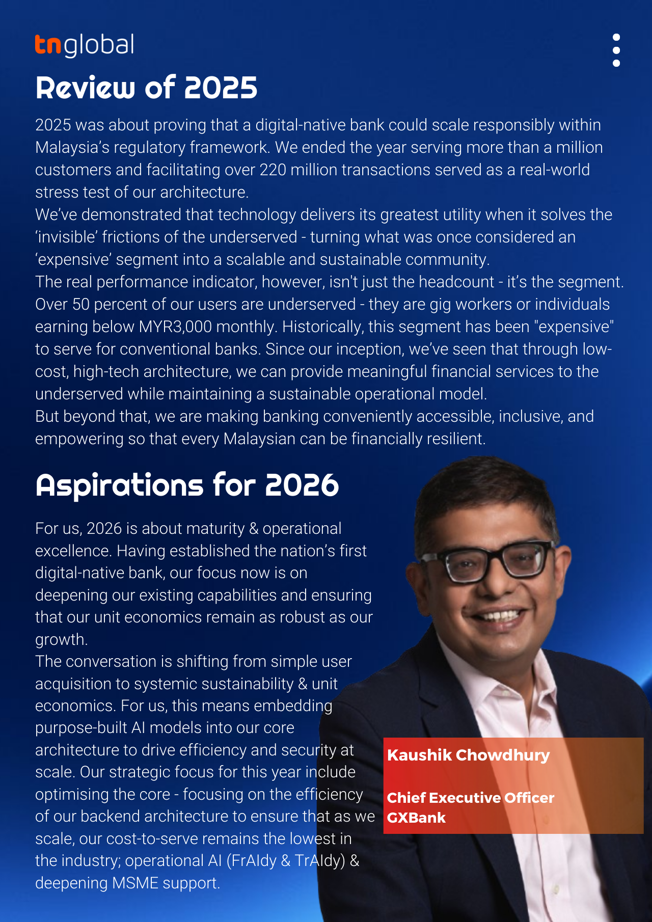 We talked to Kaushik Chowdhury, Chief Executive Officer of GXBank, to learn more about GXBank’s achievements in 2025 and its plans and aspirations for 2026. He also shared his views on the outlook of the digital banking industry in Malaysia.