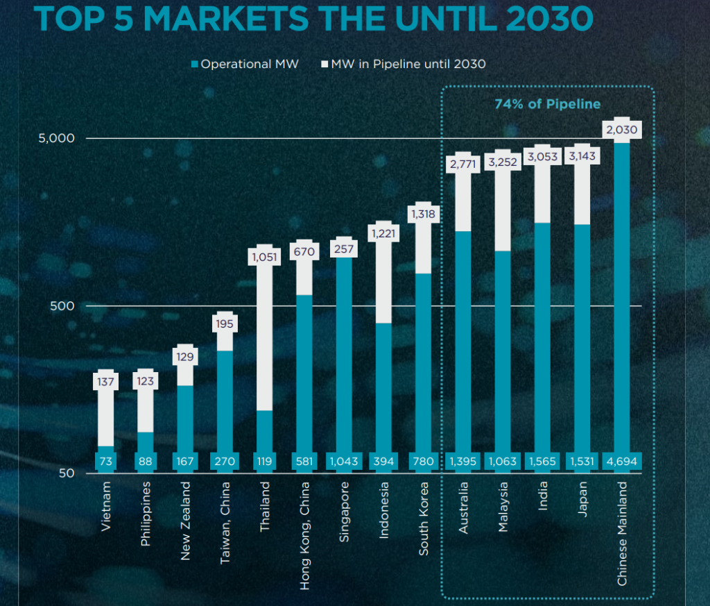 Regarding operational data centers and targets for 2030, the report showed that mainland China is the top one in the region with 4,694 MW of operational data centers and 2,030 in development. Other top ones in the region are Japan, India, Malaysia, and Australia.