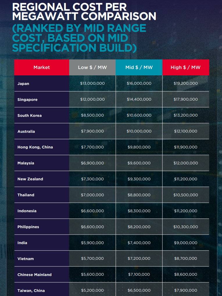 Data center cost in Asia-Pacific. Source: Cushman & Wakefield.